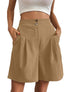A pair of high-waist shorts featuring pleated front details, side pockets, and a button-front closure.