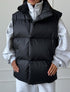 Quilted puffer vest with an oversized silhouette. Perfect for layering over sweats or casual wear. Features a zip-up front and high neckline.