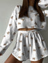 Printed lace crop top with cutouts and matching shorts. A trendy two-piece set perfect for warmer weather.