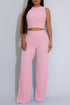 Two-piece lounge set with sleeveless top and wide-leg pants. Features a soft knit look with effortless appeal. Perfect for home or street wear.