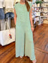 A sleeveless jumpsuit featuring wide-leg design, allover stripes, and a loose fit.