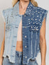 Two-tone denim vest with studded detailing. Frayed edges add a touch of rugged style.
