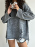 A long sleeve top with an acid wash finish, dropped shoulders, and distressed cutout accents along the hem.