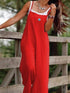 Loose-fitting jumpsuit with unadjustable straps, pockets desin, and wide legs.