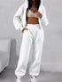 Cozy zip-up hoodie with matching joggers. Elastic waistband and cuffs. Ideal for lounging or casual outings.