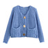 A chunky knit cardigan with oversized buttons and front pockets, perfect for cozy layering in cool weather.