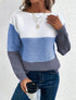 Casual knit sweater with bold color blocking. Relaxed fit with ribbed cuffs and hem. Perfect for layering in cool weather.