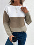 Casual knit sweater with bold color blocking. Relaxed fit with ribbed cuffs and hem. Perfect for layering in cool weather.