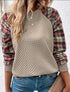 A casual pullover featuring quilted texture, plaid long sleeves, and a round neckline.