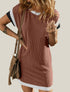 A mini dress featuring a round neck, short sleeves, and a relaxed fit with a striped design and chest pocket detail.