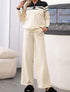 Loungewear set with contrast collar and stripe details. Button-up top with matching straight-leg pants. Perfect for a cozy day in.
