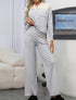 Loungewear set with contrast collar and stripe details. Button-up top with matching straight-leg pants. Perfect for a cozy day in.