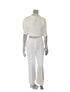 A pant set featuring a cropped long sleeve top and high-waist pants. Offers a modern, fitted silhouette. Ideal for a stylish day or night outfit.