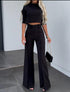 A pant set featuring a cropped long sleeve top and high-waist pants. Offers a modern, fitted silhouette. Ideal for a stylish day or night outfit.