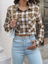 Cropped plaid shirt with buttoned pockets. Versatile for pairing with high-waisted bottoms. A trendy addition to your collection.