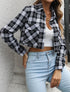 Cropped plaid shirt with buttoned pockets. Versatile for pairing with high-waisted bottoms. A trendy addition to your collection.