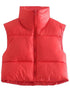 A cropped puffer vest designed with a high collar, sleeveless cut, and zip-front closure for a stylish and cozy look.
