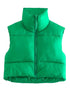 A cropped puffer vest designed with a high collar, sleeveless cut, and zip-front closure for a stylish and cozy look.