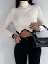 A cropped turtleneck sweater with a unique cutout hem, designed for a modern and bold style.