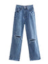 Wide-leg jeans with distressed detailing and fringe edges, offering a laid-back, trendy look.