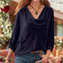 Blouse with a draped neckline and 3/4 sleeves. Relaxed fit for an elegant casual look. Perfect for day or evening wear.