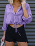 A cropped denim shirt featuring a front button closure, drawstring waist, and long sleeves with rolled cuffs.
