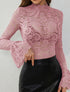 A lace top with bell sleeves, high neck, and intricate lace patterns.