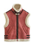 A sleeveless quilted vest featuring faux fur design, front zipper closure, and adjustable buckle details.