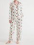 Long sleeve pajama set with festive prints. Button-up top with piping detail. Full-length pants for cozy nights.