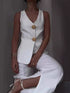 Fitted set with notched vest and trouser pants. Vest with button-up, a V-neckline, and notched hem. Trouser pants with wide legs and side split hem.