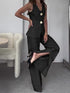 Fitted set with notched vest and trouser pants. Vest with button-up, a V-neckline, and notched hem. Trouser pants with wide legs and side split hem.