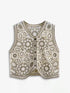 Sleeveless crochet vest with floral detailing. Button-down front.