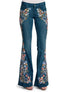 Flare denim jeans featuring intricate floral embroidery on the front and a fitted waist.