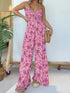 A wide-leg jumpsuit with an allover floral print, featuring a smocked bodice, adjustable cami straps, and a relaxed fit.
