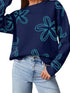 A pullover sweater with a floral pattern, round neckline, long sleeves, and ribbed hem.