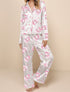A satin pajama set with floral prints. Includes a button-up top and loose-fit pants. Ideal for a stylish sleepwear look.