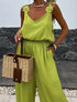 A wide-leg jumpsuit featuring floral strap details. Designed with a relaxed fit and adjustable waist. Great for casual and vacation wear.