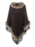 A poncho with a loose fit, featuring fringe trim and fur detailing along the edges. Ideal for layering on cooler days.