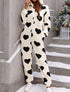 Fuzzy hooded onesie with heart prints. Relaxed fit for maximum comfort. A playful and cozy option for staying warm.