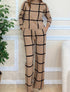 Matching knit set with a bold grid pattern. Includes a long-sleeve top and wide-leg pants. A stylish and comfortable option for cooler days.