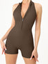Halter romper with zip front closure. Fitted bodice and shorts.