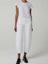A pair of high-waisted jeans featuring a relaxed fit, five-pocket design, and cropped length.