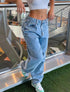 A pair of wide-leg jeans featuring a high-waisted design and relaxed fit.