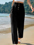 High-waist pants with wide legs, pleated details, and decorative button closure at the front.