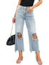 High-waisted jeans with wide legs. Distressed details with frayed hems.