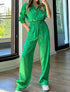 A set with allover leopard prints. Button-front shirt. A pair of wide-leg pants.