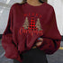 Cozy top with "Merry Christmas" graphic. Features festive trees with plaid and leopard prints. Perfect for holiday cheer.