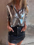 Metallic button-up shirt with a shiny finish. Adds a touch of glam to both casual and evening looks.