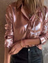 Metallic button-up shirt with a shiny finish. Adds a touch of glam to both casual and evening looks.