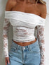 Off-shoulder lace crop top with long sleeves. Stylish and feminine, great for pairing with high-waisted jeans or skirts.